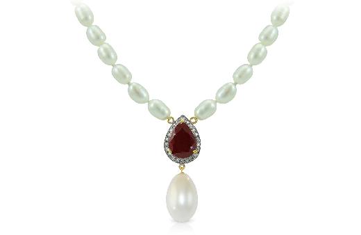 Vera Perla 18K Gold 0.12ct Diamonds, Royal Indian Ruby and 13mm Pearl Necklace